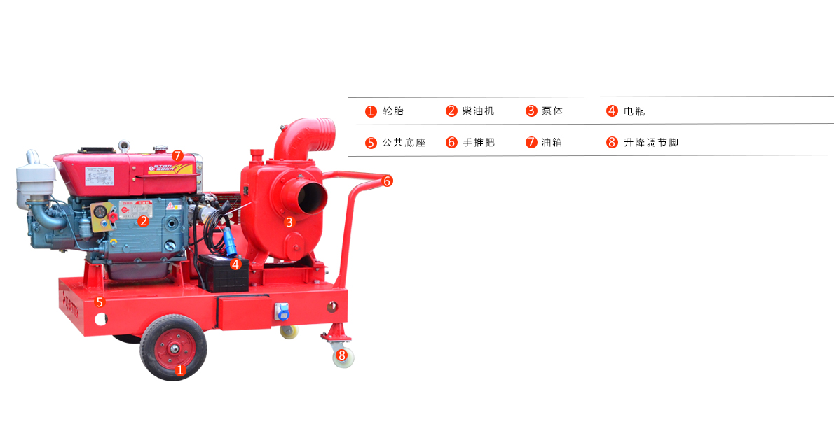 2.手推式強自吸移動泵車主要由真空輔助裝置、柴油機動力包、柴油機專用油箱、泵傳動系統(tǒng)、設(shè)備底座、自吸泵總成、防雨設(shè)施、起動裝置、起動電源裝置、進水管總成、出水管總成、二輪移動拖車系統(tǒng)、快速起吊裝置等組成。