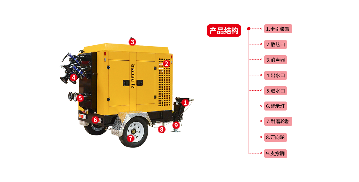 高效率:拖車式移動排澇泵車的效率高,能夠將動力源的功率充分轉化為泵送能力,滿足各種大量泵送的需求。